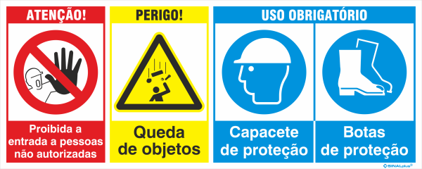 Proibida a entrada a pessoas não autorizadas + Queda de objetos + Uso obrigatório de capacete e botas: 1000x400 PP alveolar